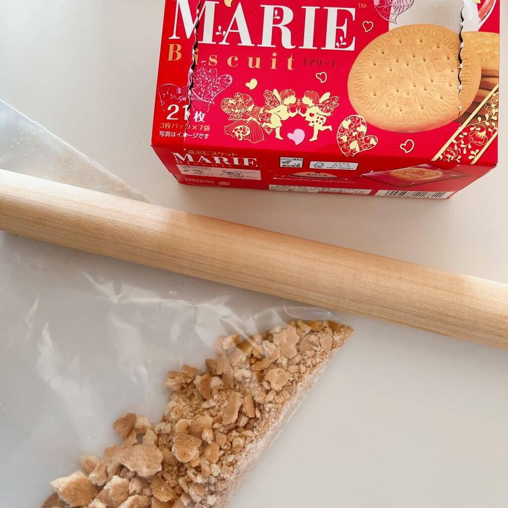 さて、材料を用意してビスケットを砕いていると娘が学校から帰宅。(作り始めるタイミングがすでに失敗の予感…。)