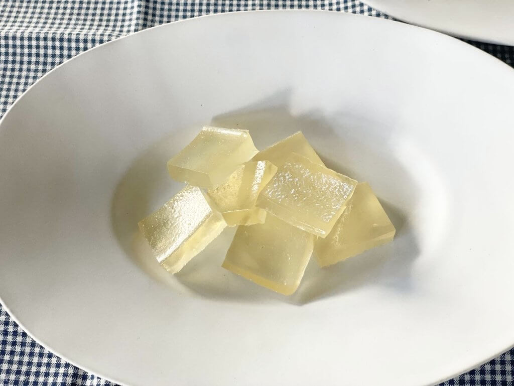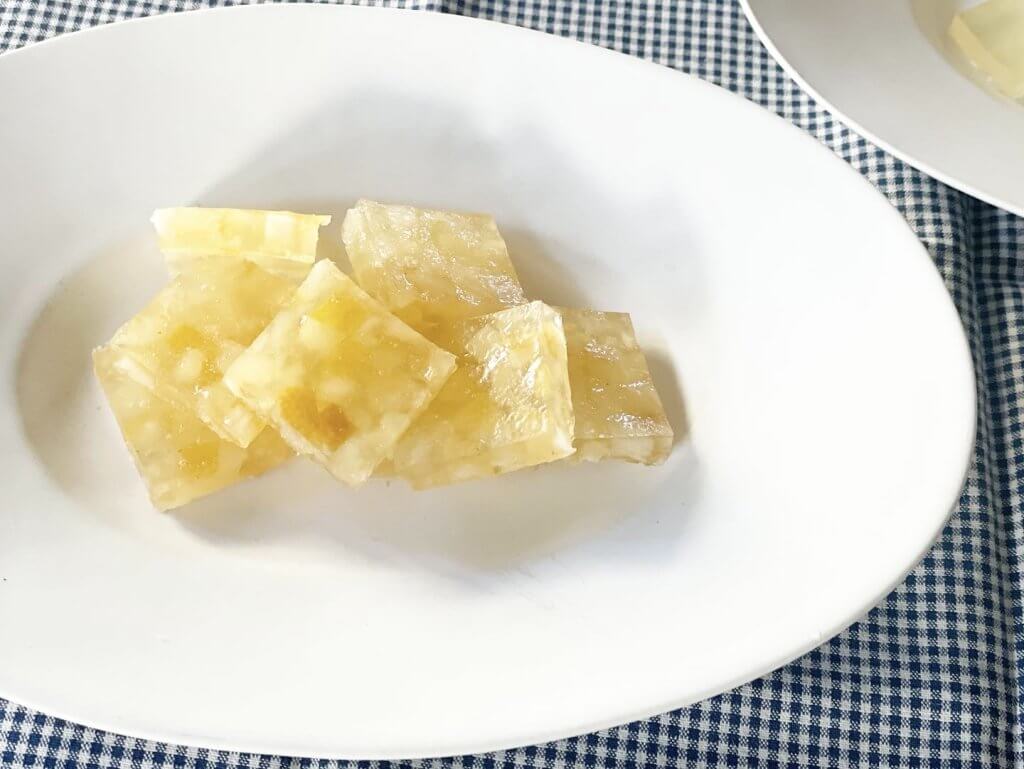 ちゃんと、食感のあるグミになります。ゼラチンは、シートタイプも粉タイプも試したのですが、こちらもあまり差がなく作ることができました。