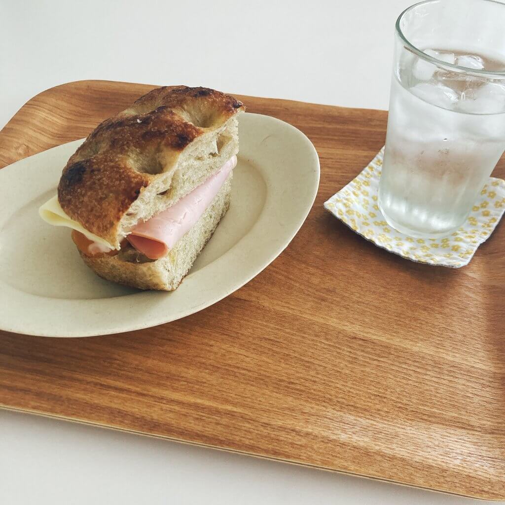 フォカッチャは、冷蔵庫にかろうじて残っていたスライスチーズとハムを挟んでサンドイッチに。