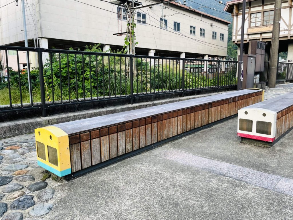 こちらのベンチは、電車をモチーフにしてて可愛い。