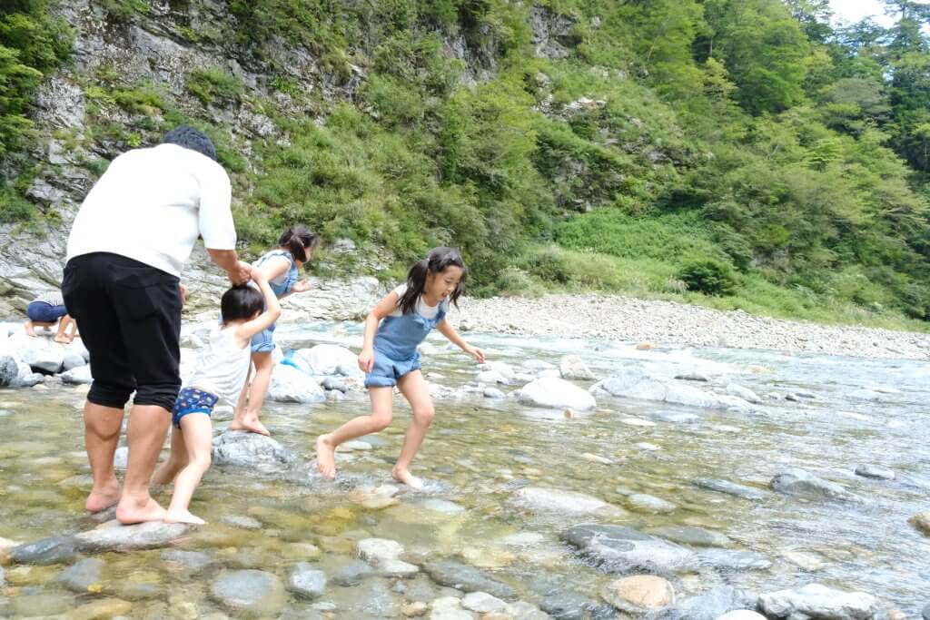 欅平を降りて、階段を下がって行くと、川辺で遊べる場所と足湯があります。