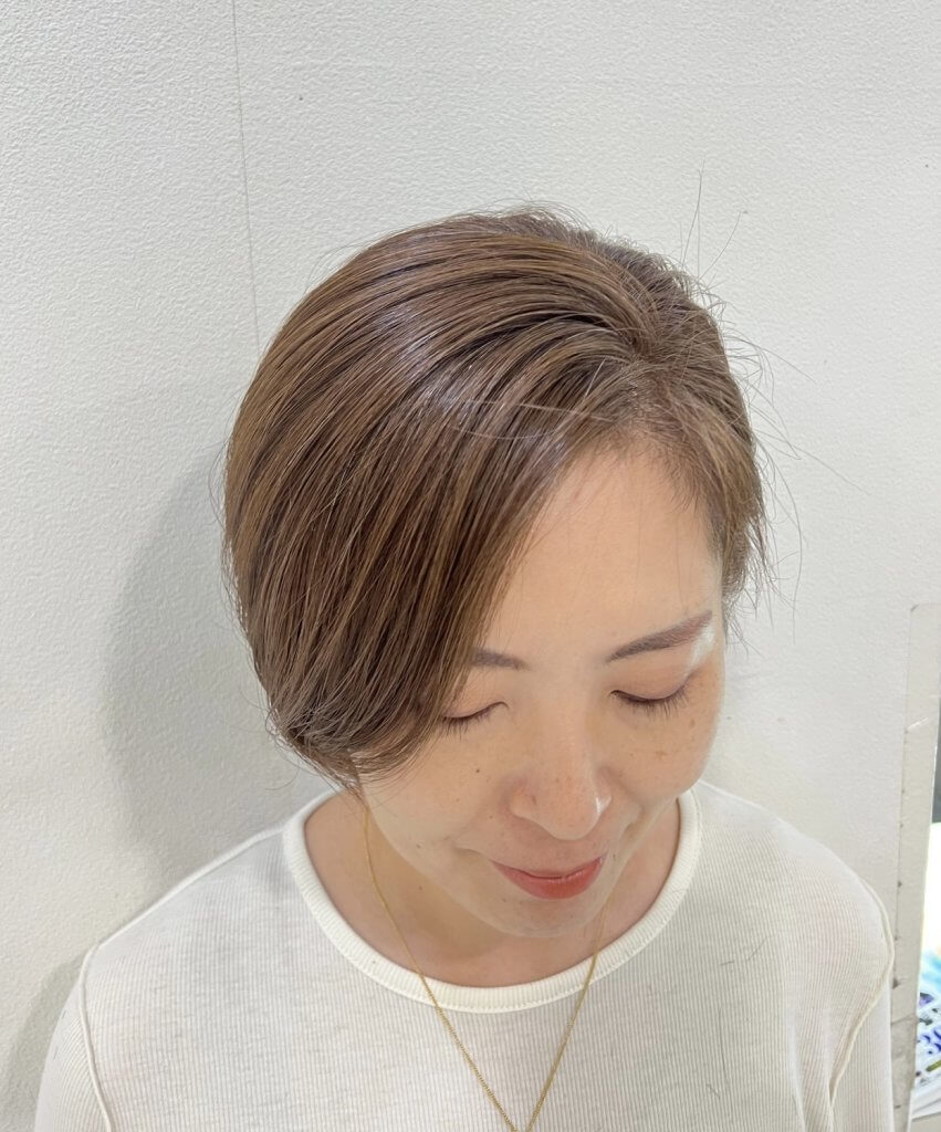 カラーは重すぎないアッシュベージュにしてくださいました。白髪のギラつきを抑えて艶髪に♬