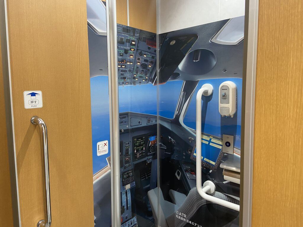 空港内のトイレ。綺麗です。トイレの一室はコックピット風!笑