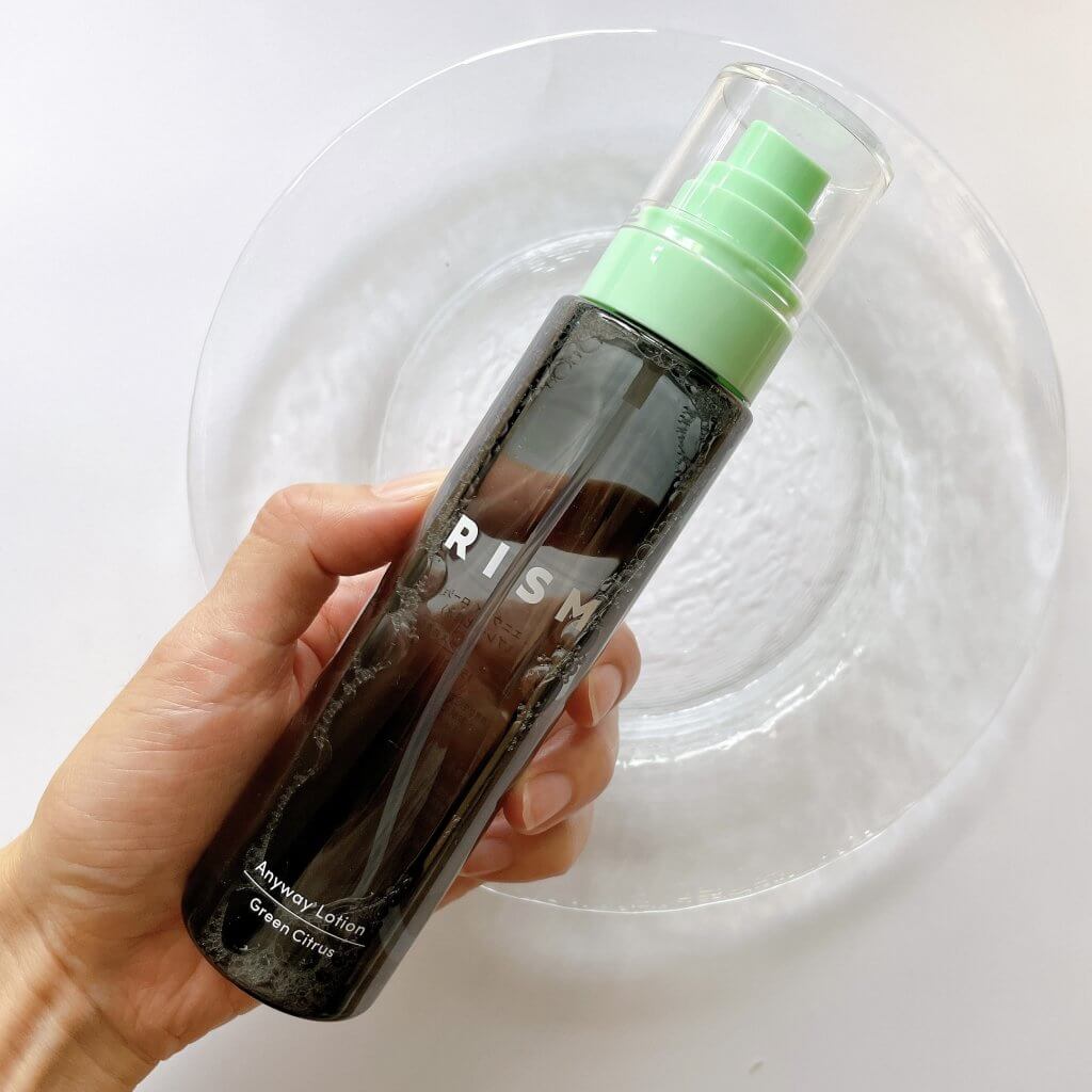RISMのスキンケアシリーズには、「グリーンシトラス」と「スウィートガーデン」の2種類の香りがあるのですが、今回は「グリーンシトラス」の化粧水Anyway Lotionと、ミルク美容液Calming Milk Essence、美容液バームのTo−go Skin Balmの3種類をお試しさせていただきました。