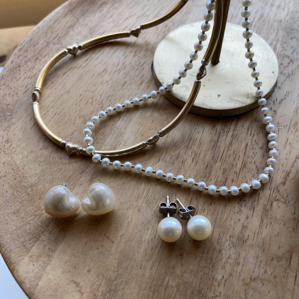 普通のパールより少し大きめで、顔まわりを明るくしてくれ、このさりげないハートがまたかわいいのです。100人隊でもお揃いの方もたくさん♡