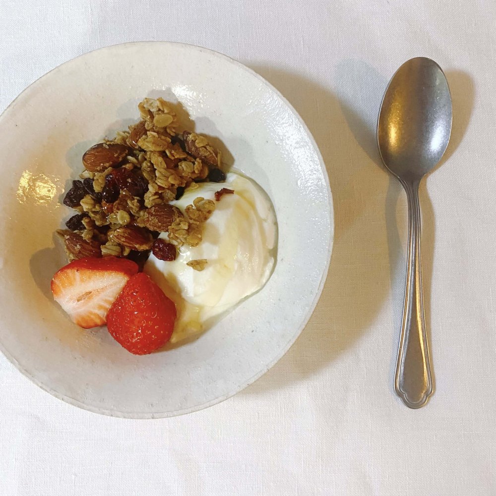 次の日はグラノーラの朝食。ヨーグルトとイチゴにハチミツをかけていただきました。