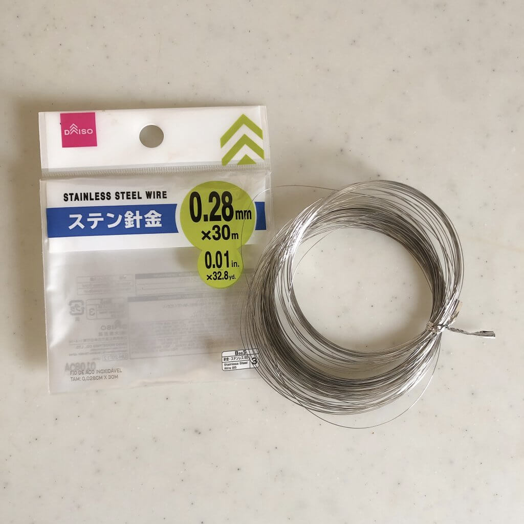 私は以前セリアで購入した細いステン針金でとめましたが、手芸用の糸で結んでとめてもできると思いました。