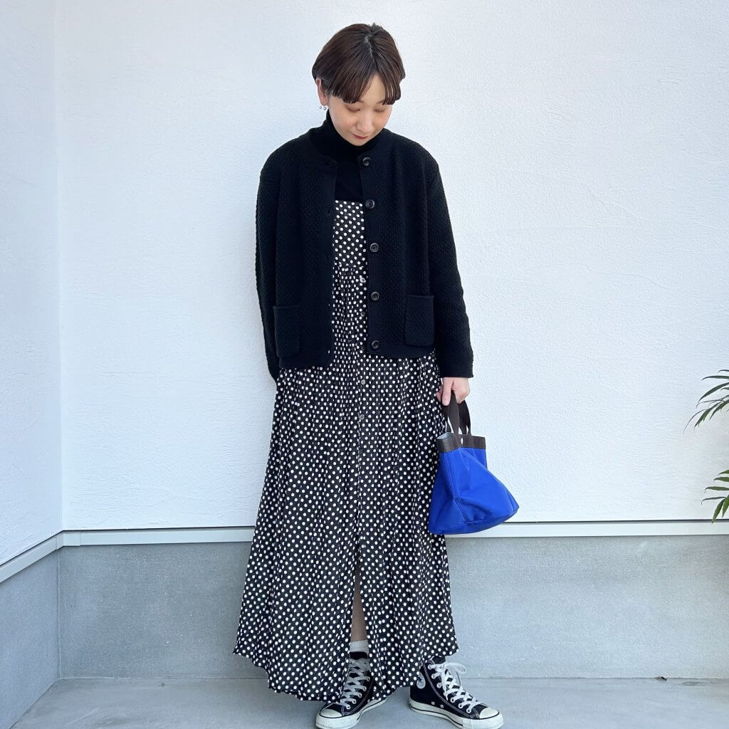 ショート丈なので、スカートやパンツやワンピース、どんなお洋服にも合わせやすいですよ。