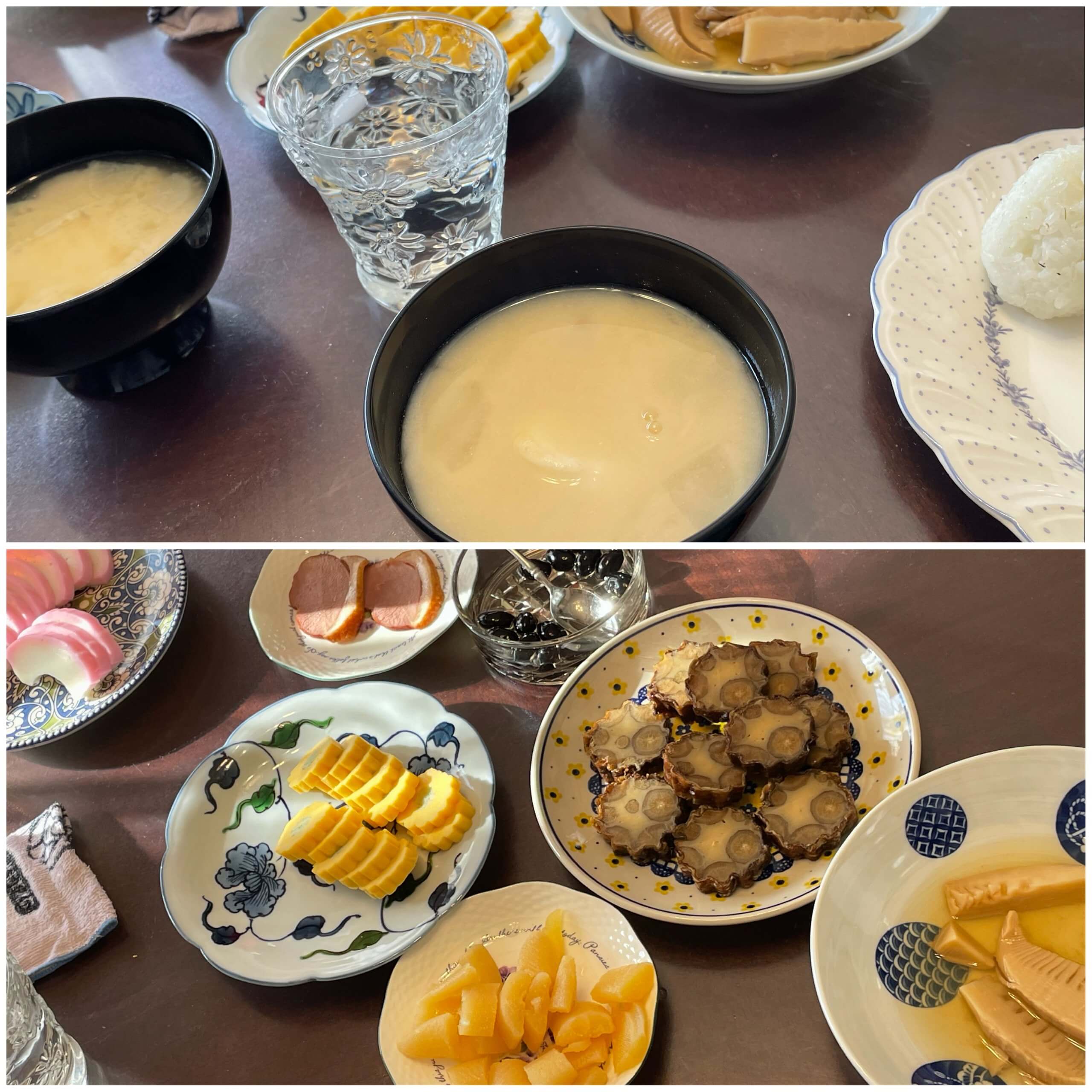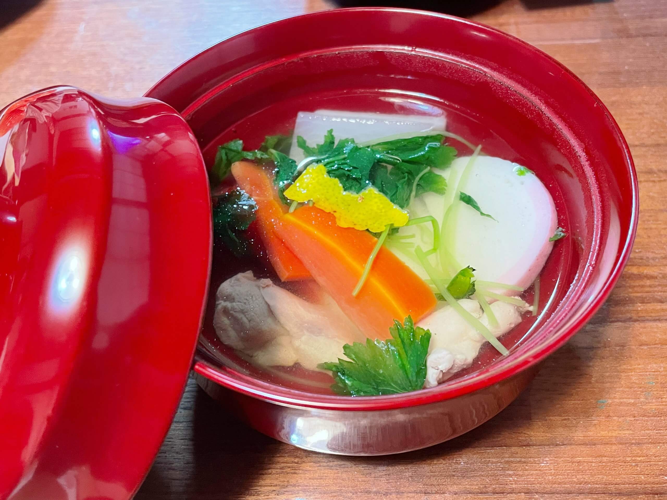 まずは朝食。義実家でお雑煮を食べました。義実家のお雑煮はおすましです。