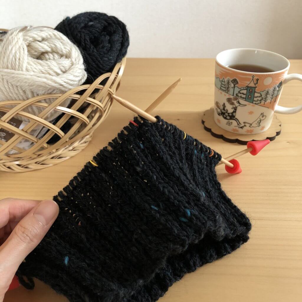 編み込み模様に入る前はひたすらゴム編み。単調ではありますが、無心になれるこのプロセスは結構好き。