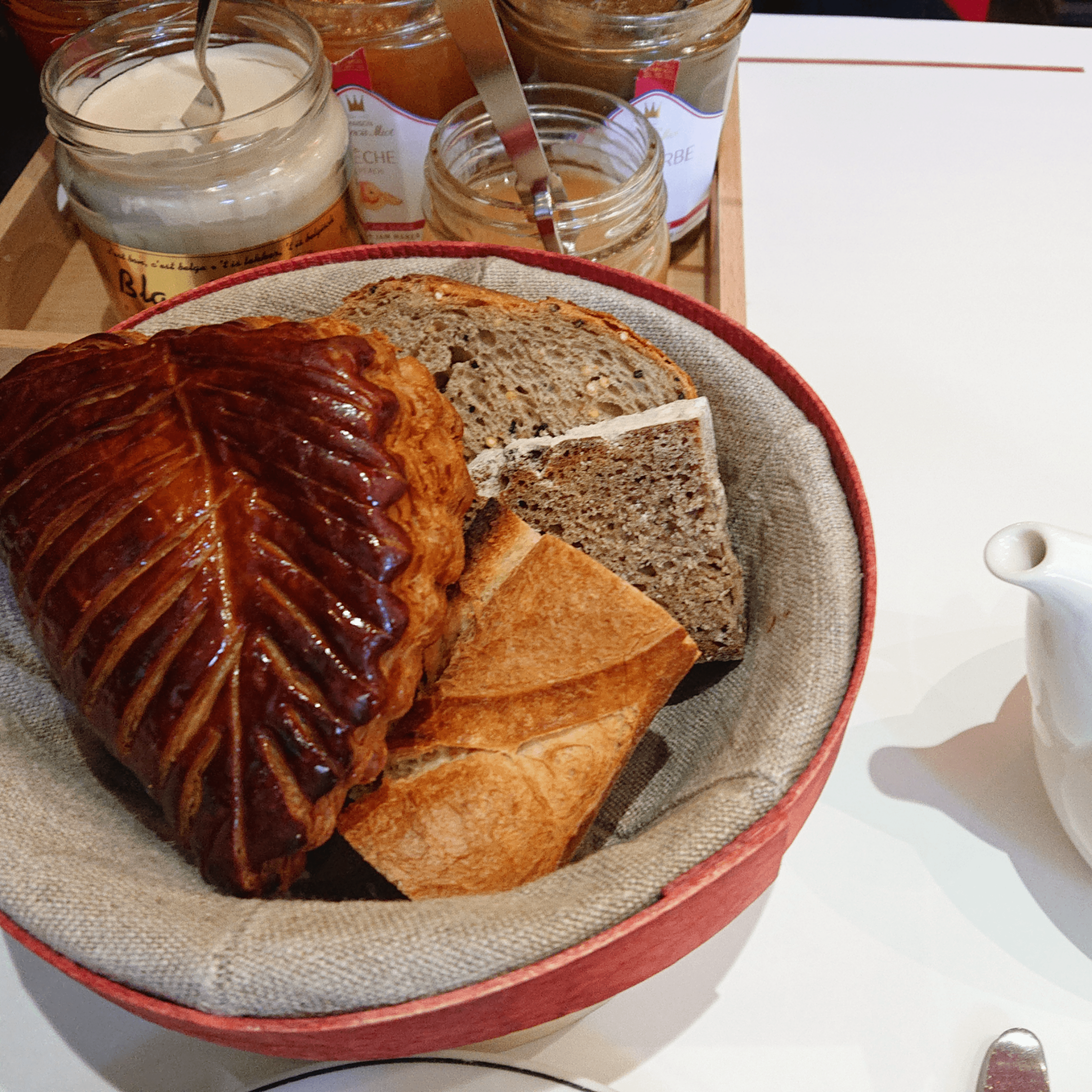 大きなかごに入った5~6種類位の甘いパンから1つ選びます。