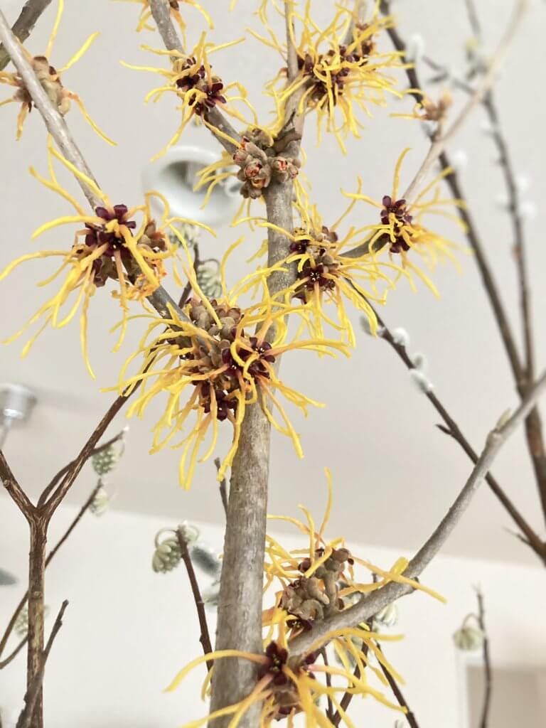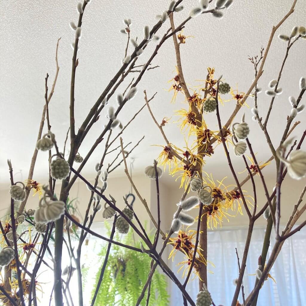 3つを合わせると、モノトーンのミツマタとネコヤナギに、マンサクがいいアクセントになっている気がします。
