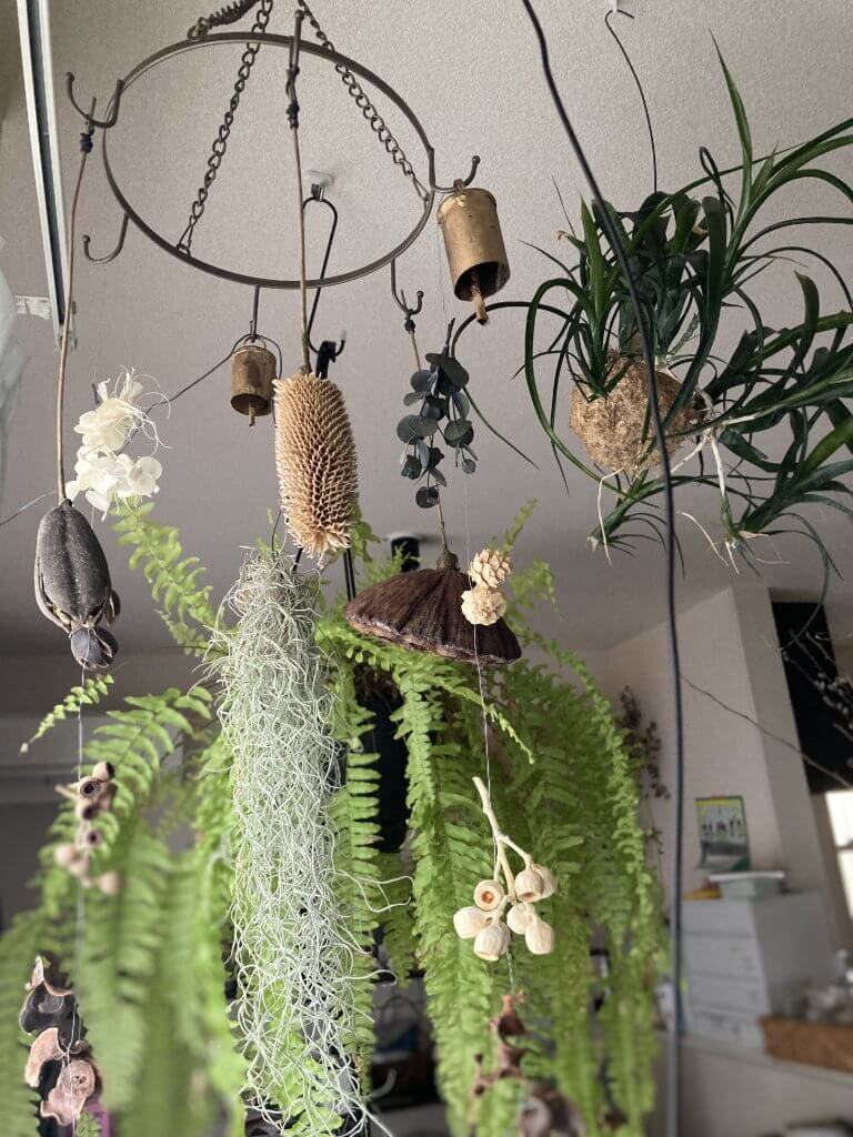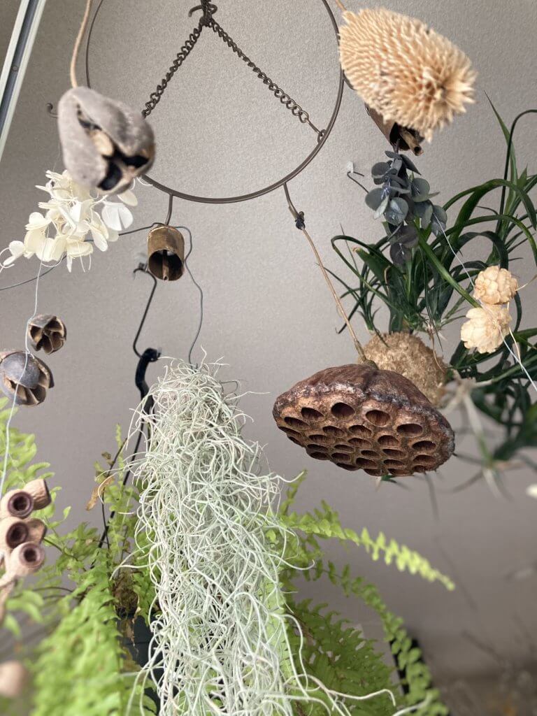 サークル型にドライフラワーやエアープランツなどをいろいろ吊り下げています。