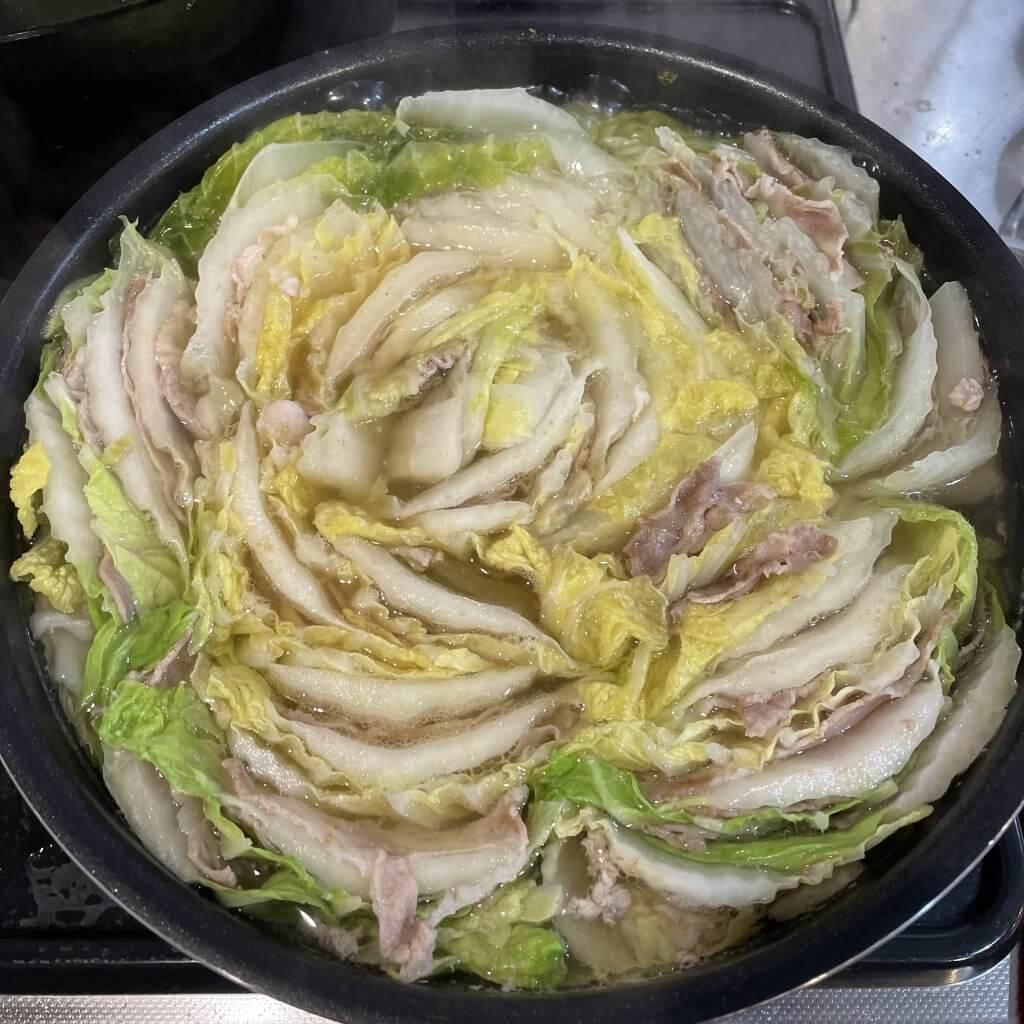 子供たちが眠っている間に白菜と豚肉を重ねて、鍋にギュギュ。