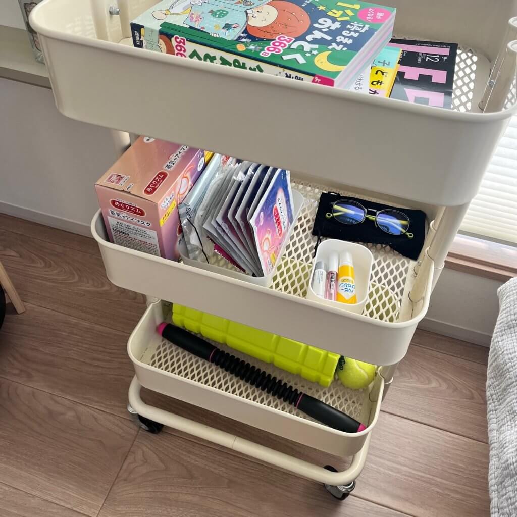 子供が赤ちゃんの頃、ベビーグッズ入れとして使っていましたが、今は寝室の雑多なモノ置き場として大活躍。