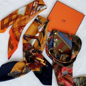 10年以上前に買ったりもらったりしたエルメスのスカーフ。当時は首元に巻いてヒラヒラさせておりました。