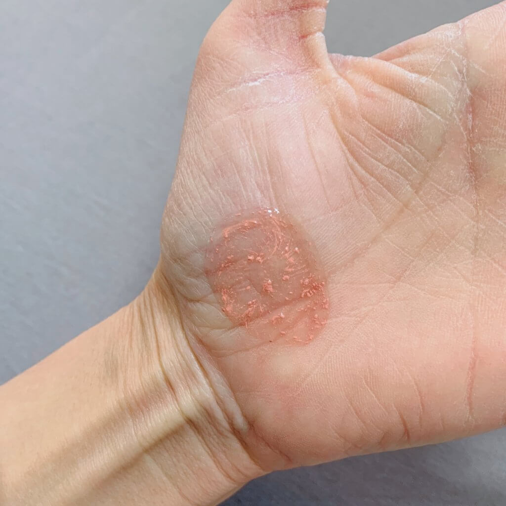 つけた感じは水っぽい感じで爽やか。指先でトントンとなじませていき、色の輪郭をぼかせて使用します。