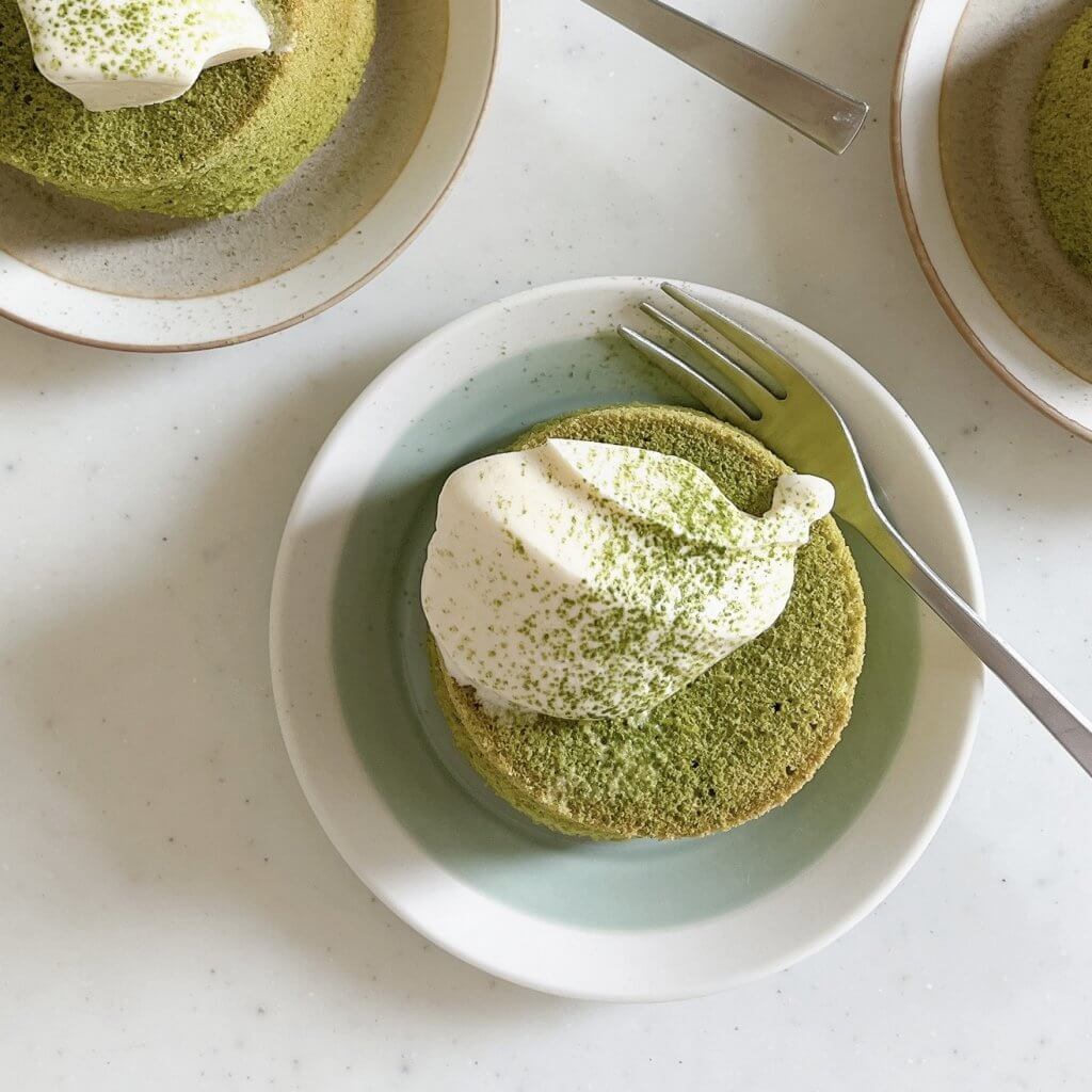 生クリームの代わりにバニラアイスを添えて抹茶パウダーをふりました。