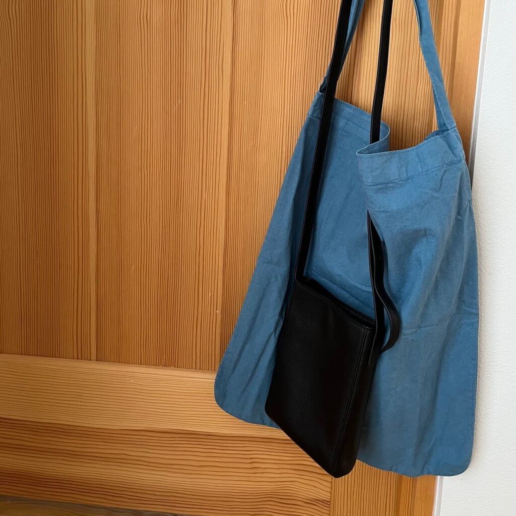 こちらのワンショルダートートもコットン素材をあと染めしたという、くすんだナチュラルな色合いで気に入ってます。