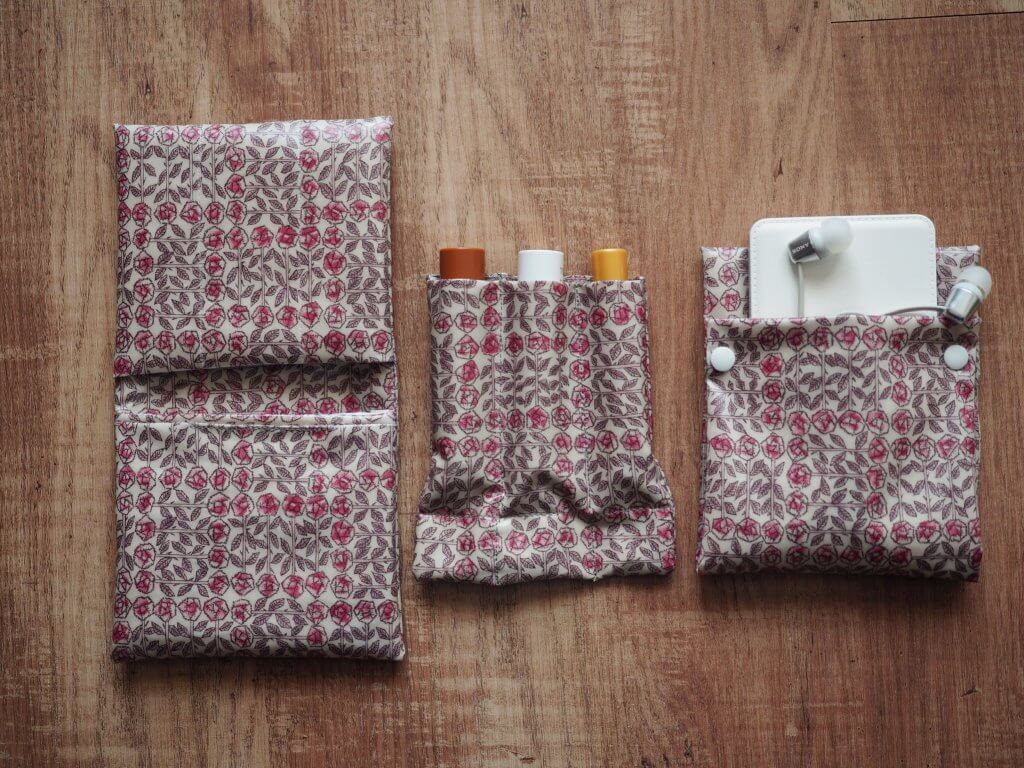 左からサニタリーポーチ、リップ入れ、モバイルバッテリーとヘッドホン入れ。