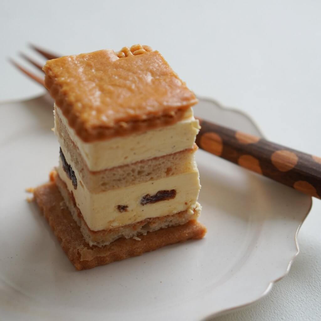 サブレ、バタークリーム、アーモンドスポンジ、バタークリーム(レーズン入り)、アーモンドスポンジ、サブレのなんと6層仕立て。