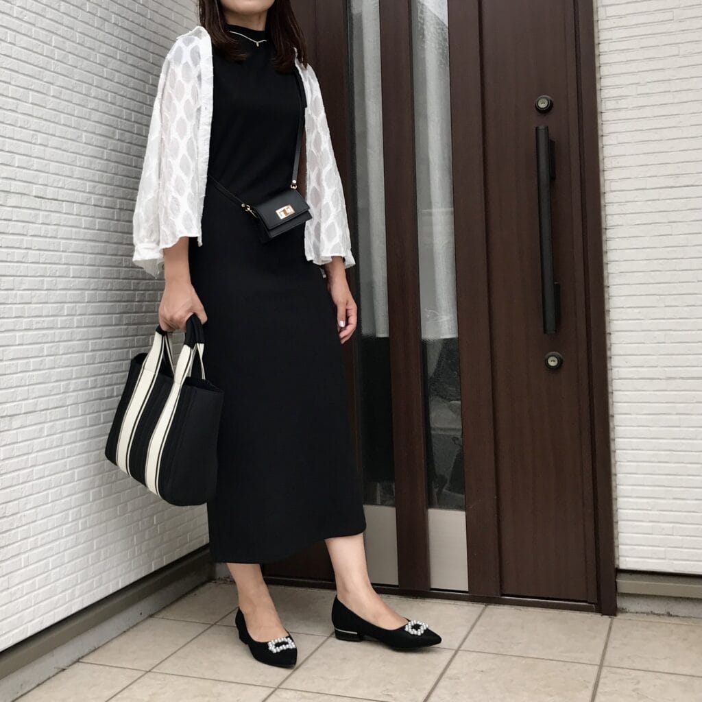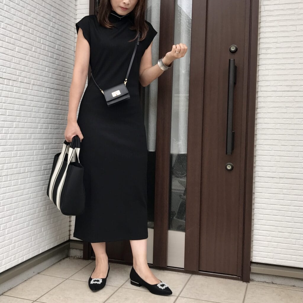 結果、無難な黒という色のセレクトで落ち着いたワンピースになりました。シンプル過ぎて寂しいかなと思い、アクセサリー感覚に身に着けていたマイクロミニサイズのバッグ。こちらはSLOBE IENAで見つけました。中に名刺でも入っていたら良いんですけどね~。入れるものが思いつかず、リップが入っていただけでした。笑