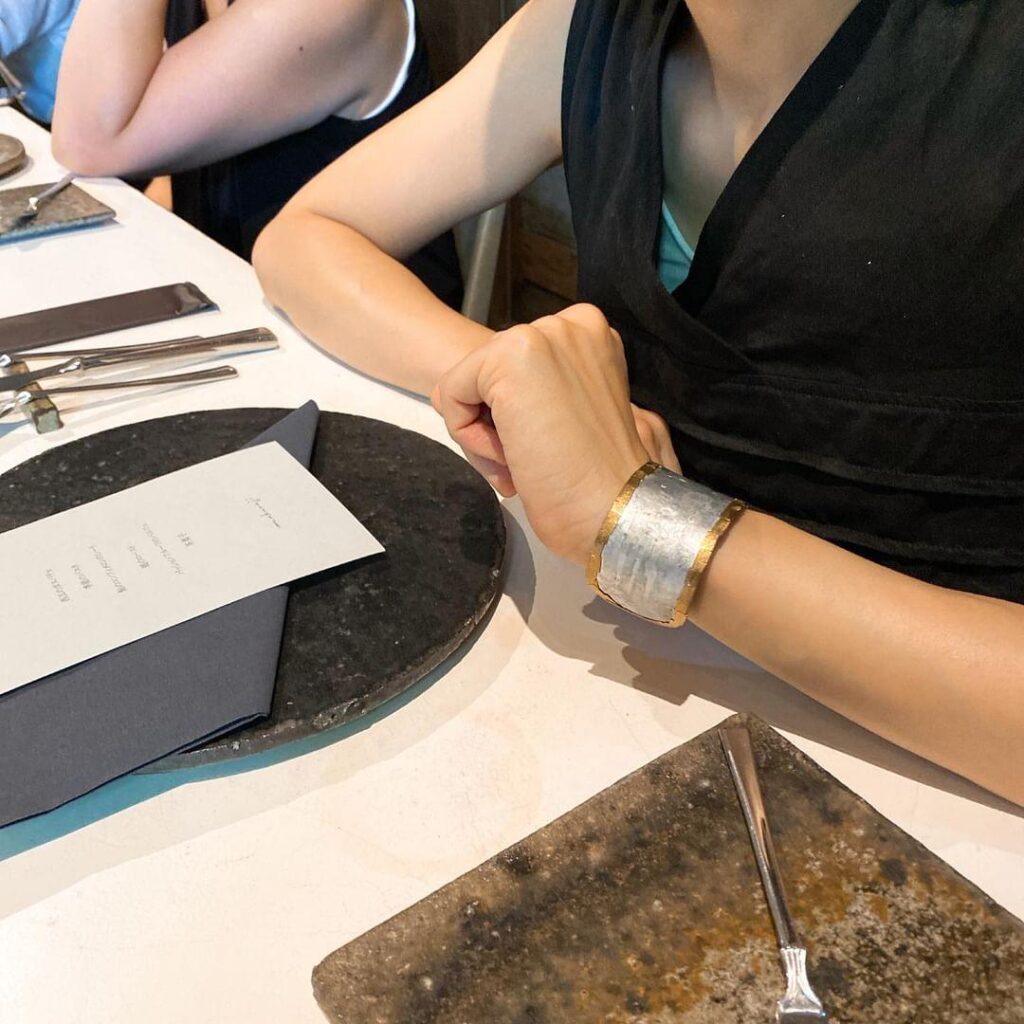 ブレスレットはトキノマニマニさんの真鍮&トタン素材のもの。