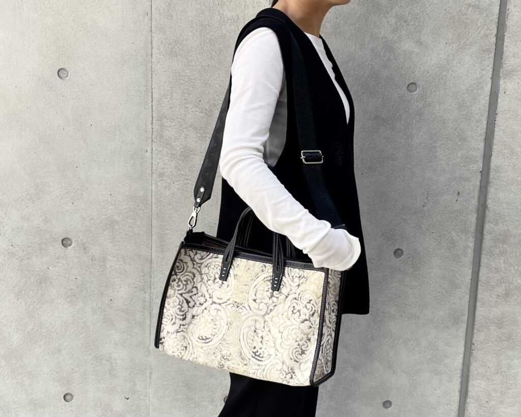 ハンドルは黒のレザー、ファブリックは金糸が織り込まれたような艶のあるダマスク柄。