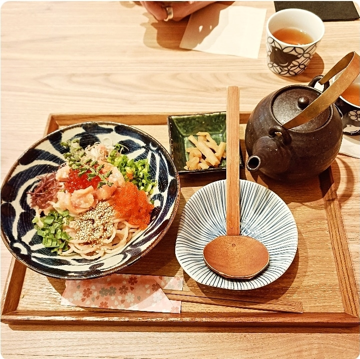 たらこスパゲッティに、サーモン、いくら、とびっこ、ふのりの海鮮尽くしに、ミョウガやシソの実などトッピングも豊富で見た目から華やか✨️どの薬味も調和がとれていて、飽きることなくさっぱりといただけます。また、こちらのお店はテーブルの上に「赤山椒、柚子七味、明太醤油」といった定番すぎないカスタムアイテムまで揃っていました♪
