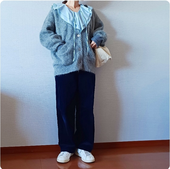 きれいめブラウス×万能グレーカーディガンコーデ