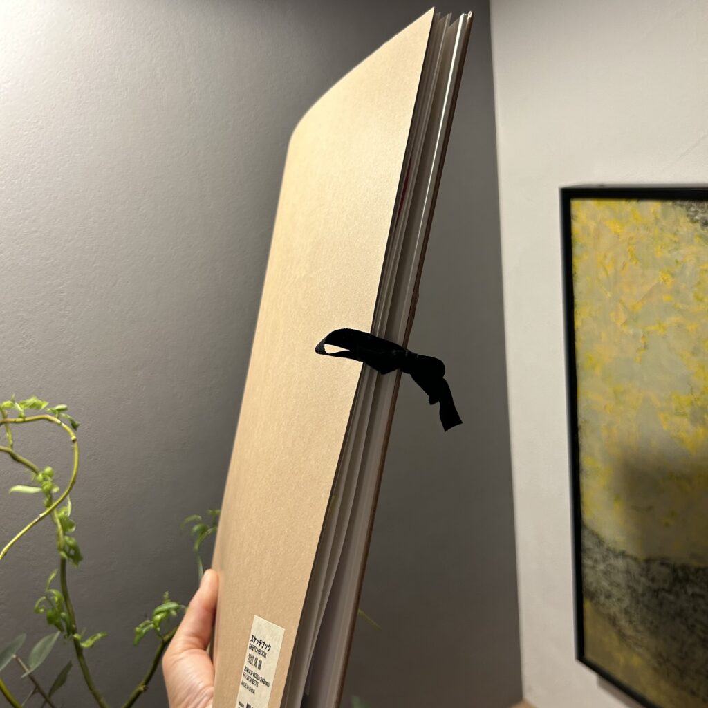 こちらの無印良品のスケッチブック使って、スクラップブックを作ることに。ページ数は20枚で332×242mmの大きさで、無地です。
