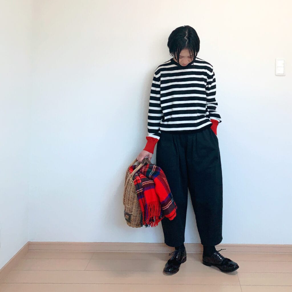 大好きなニット。袖のリブ部分が赤になっているのがポイントです。