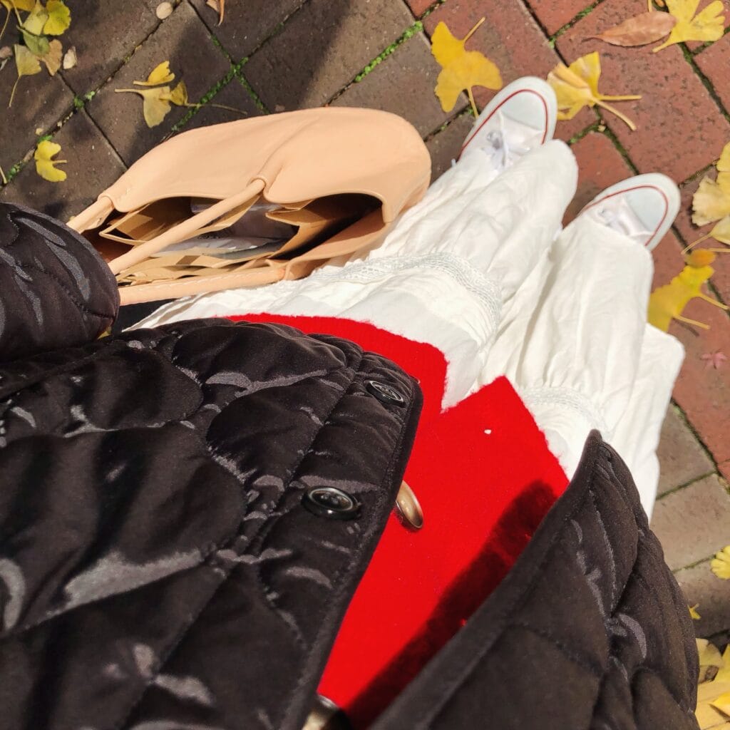 白のスカートと黒のアウターは、URBAN RESEARCH。