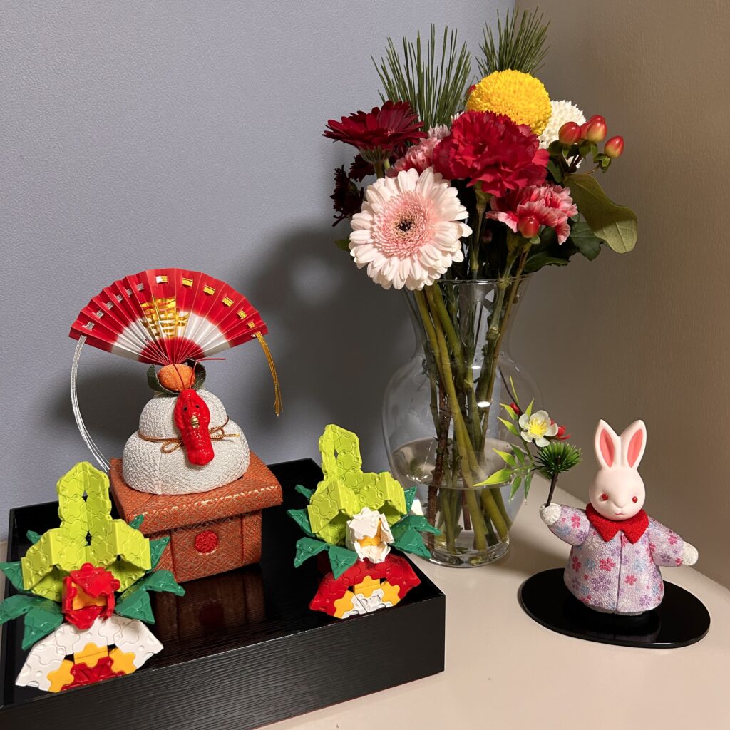 お花は夫と娘が選んで買ってきてくれ、家族みんなで作ったお正月コーナーとなりました♡