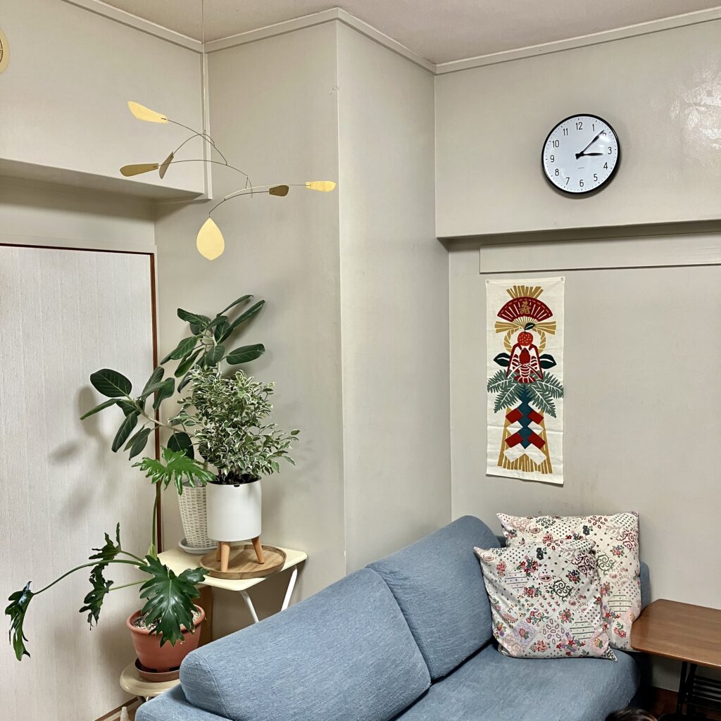 壁には「かまわぬ」の手拭いを