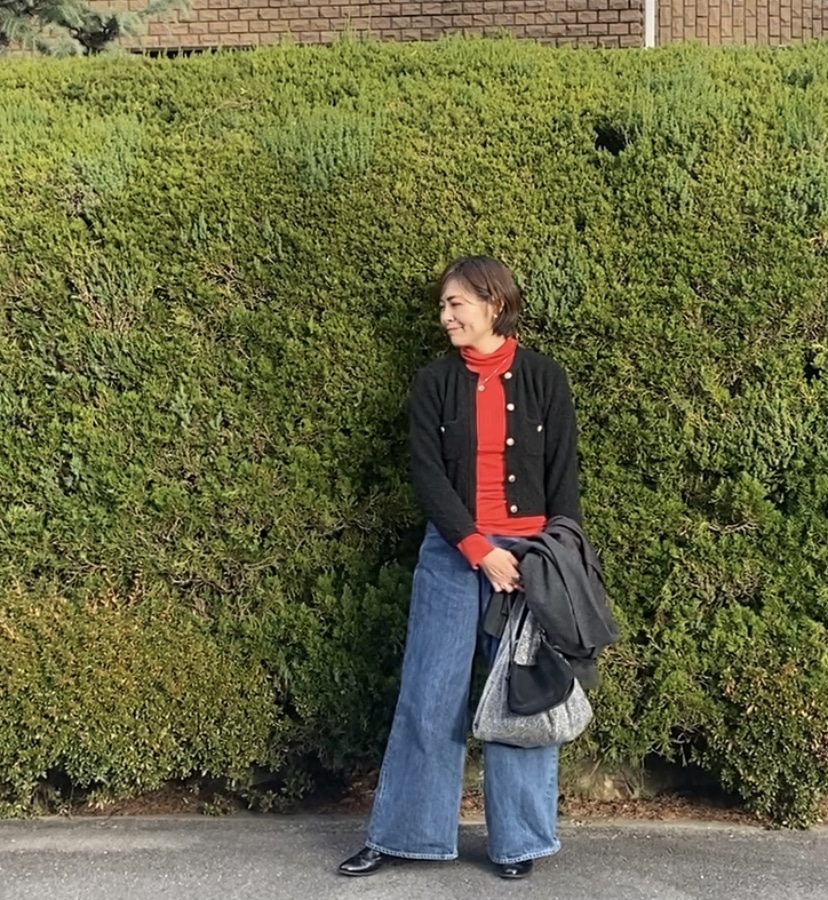 秋のはじめに購入したノーリーズのニットカーディガンにデニムを合わせました。お正月らしい華やかさをプラスしたくてインにはUNIQLOのシームレスリブタートル朱赤を。家族にも好評で嬉しかったです♬