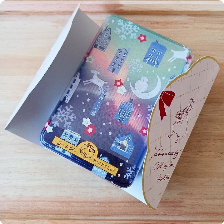 ぱかっと開けたらもう可愛い(笑)そこには夢の世界みたいな冬の夜が見えました!小さめの缶の中に、サブレでこんなに表現できるなんてすごい。。。フクロウの可愛いさよ!