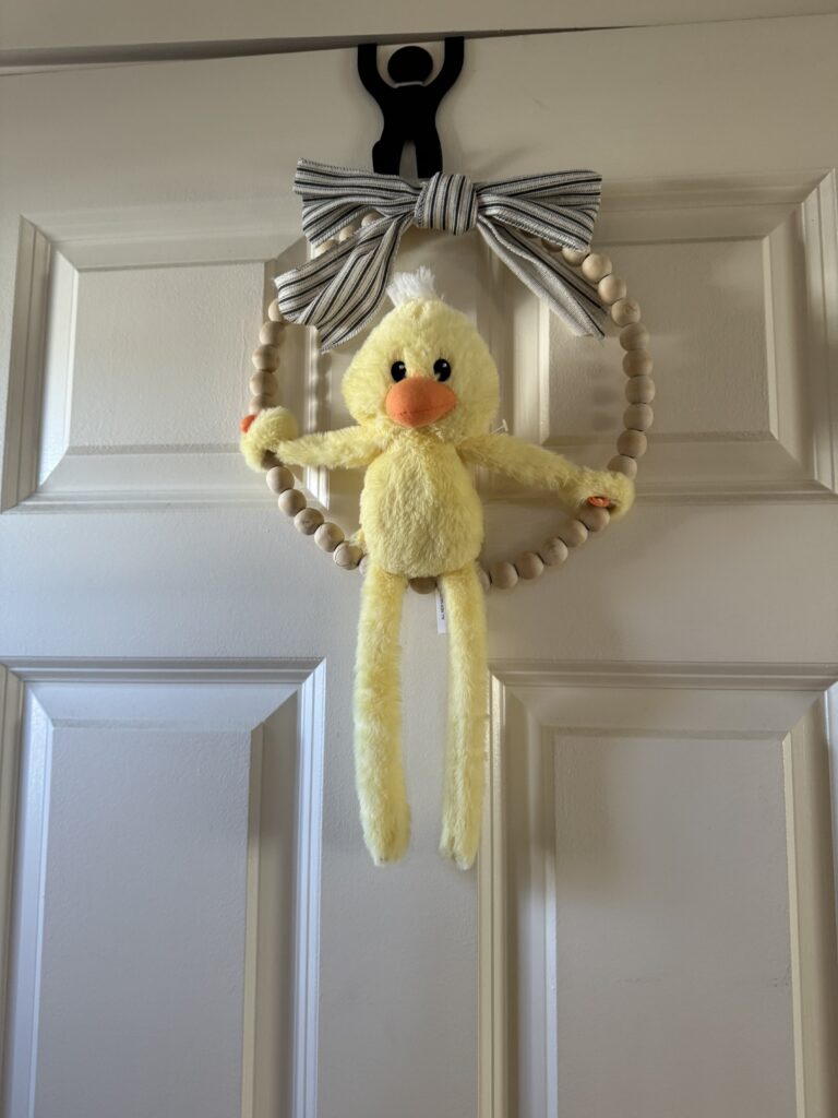 ウッドビーズを通しただけのリースにひよこさん。腕が長いので結びつけてます😅