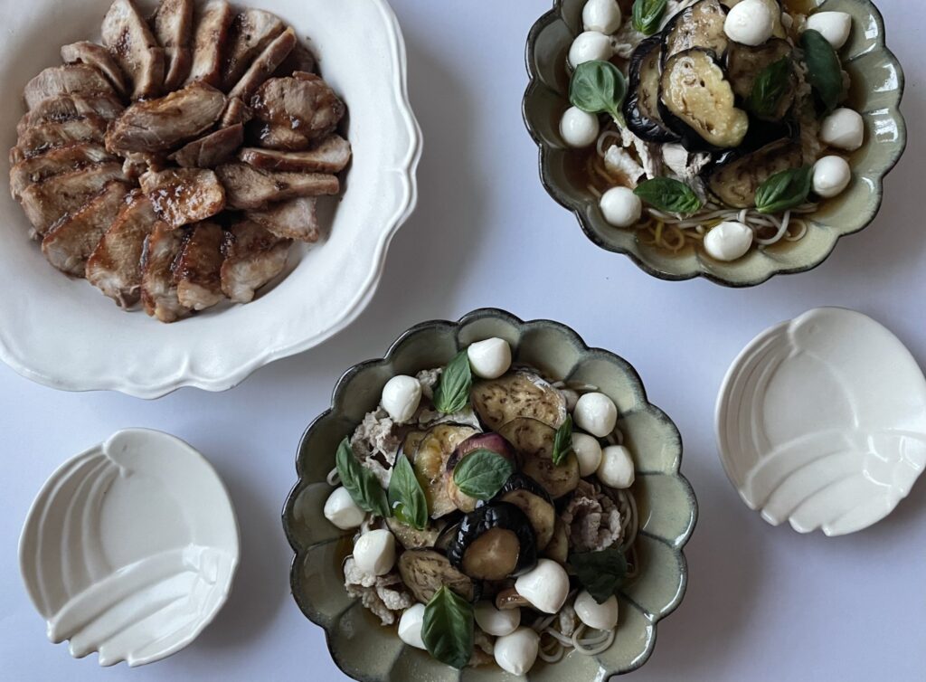 下味を付けたナスの塩気とモッツァレラチーズ、豚肉のコクが堪らない、さっぱりした一品。