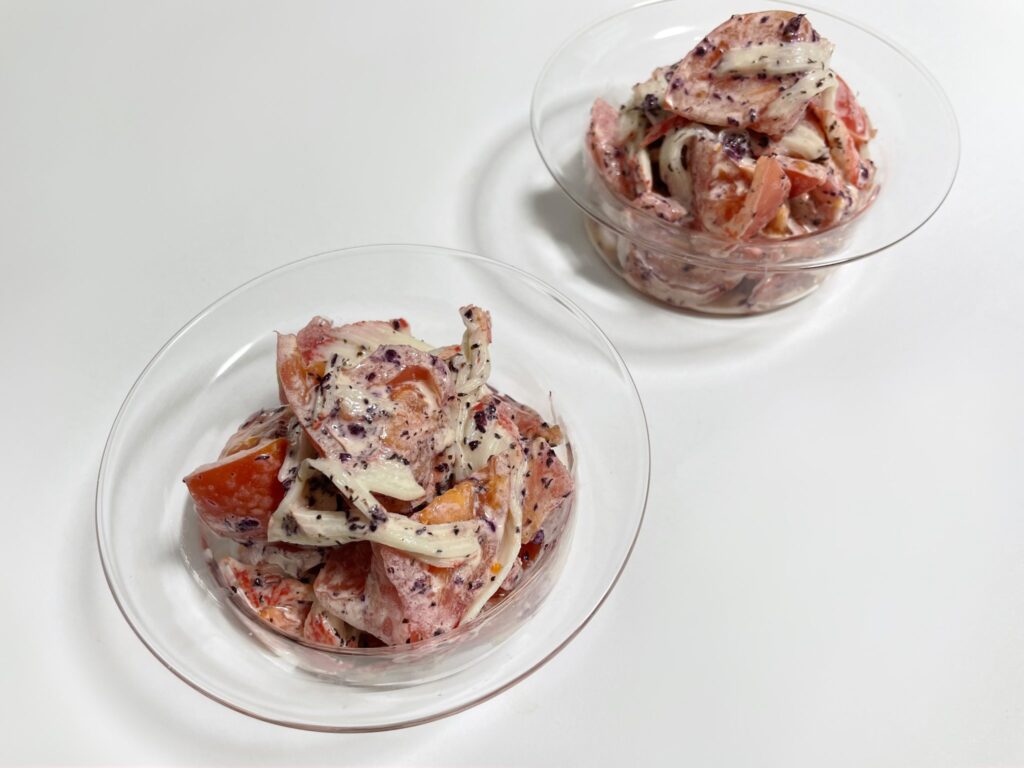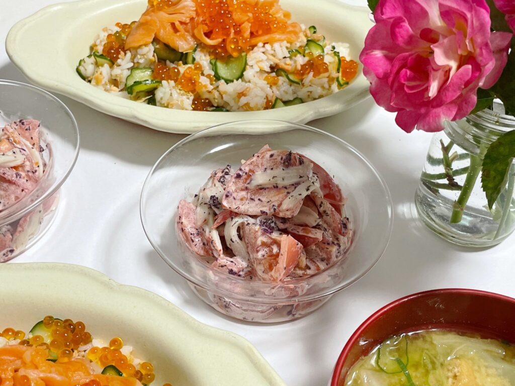 トマトのレシピが続きます…。こちらのリピレシピ。ゆかりふりかけ×マヨネーズという組み合わせの味付けが、作る前は想像出来なかったのですが、これがもう、クセになる美味しさなのです!ほんのり紫色に色づいたカニかま×トマトの赤、食卓もパッと華やかになります◎