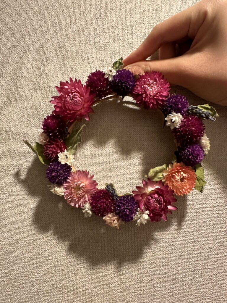 以前はドライフラワーの束を買って(とっても綺麗)いくつかに分けて壁に貼ったのですが、