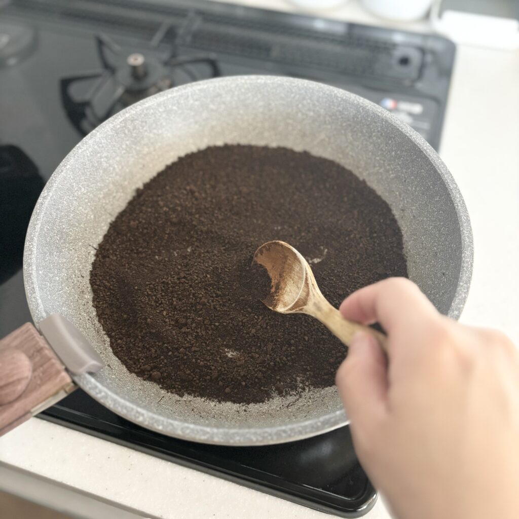 フライパンで水気が飛ぶまで煎って、消臭剤として使用します!