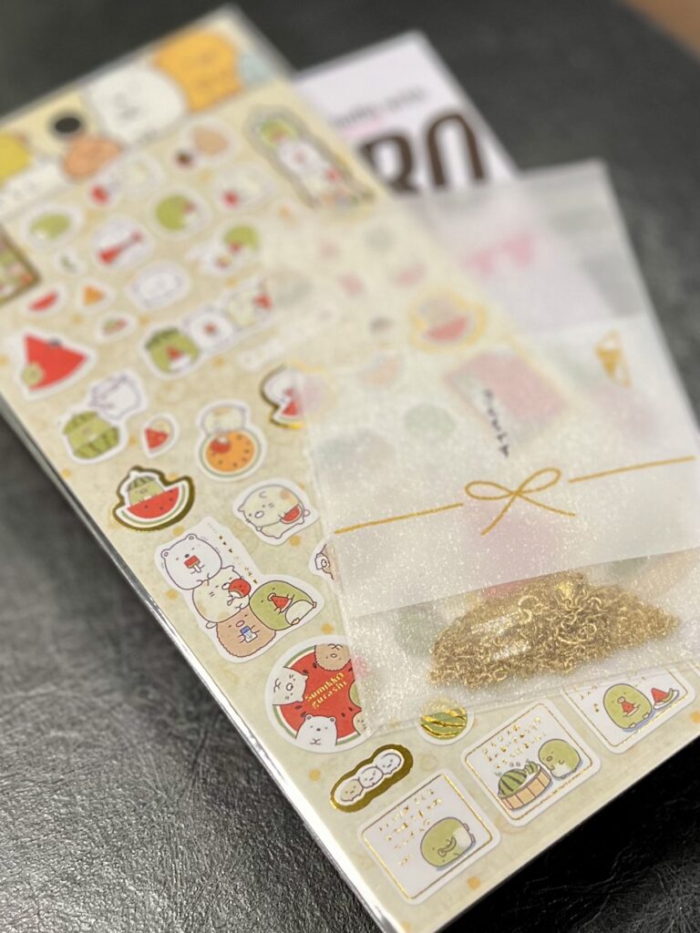 今年用意したのは、お友達それぞれのイニシャル付きネックレスにすみっこぐらしのシール、そしてお菓子で、喜んでもらえてなにより。