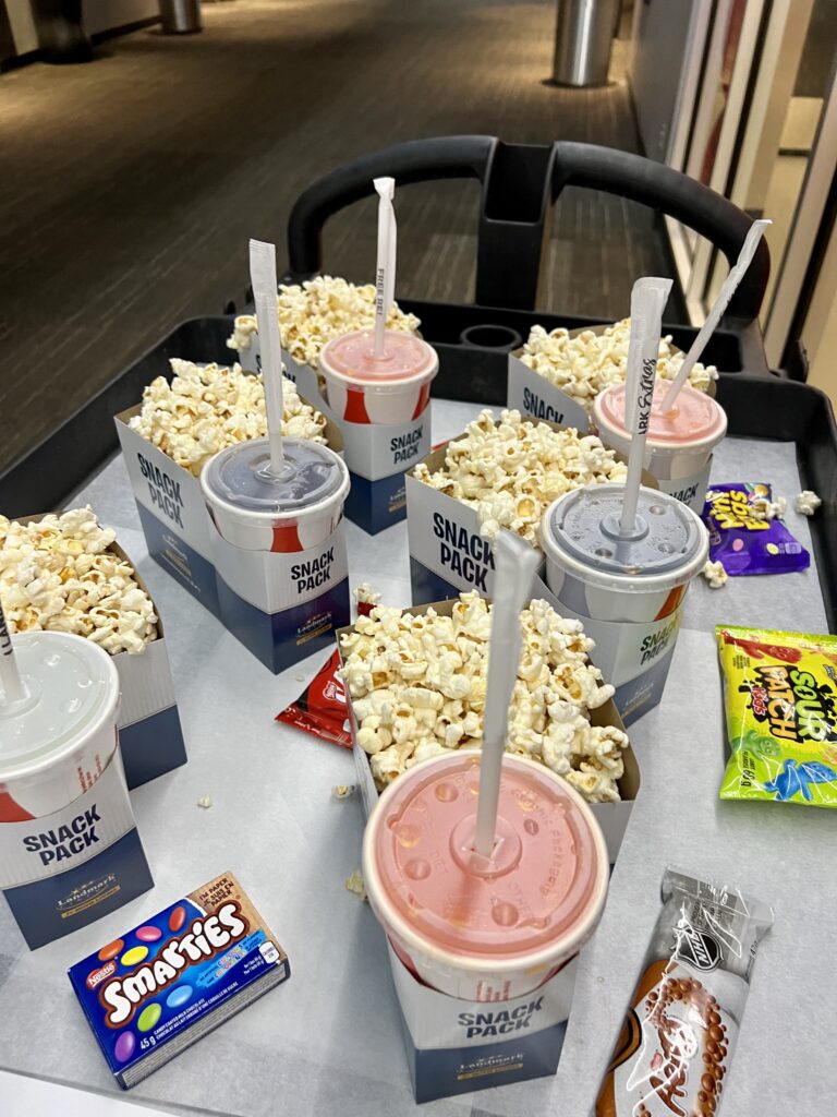 事前にオーダーしておいたポップコーン、ドリンク、スナックを、コンシェルジェ(何度も言いますが、映画館スタッフのお姉さん)がパーティルームまで持ってお出迎え。