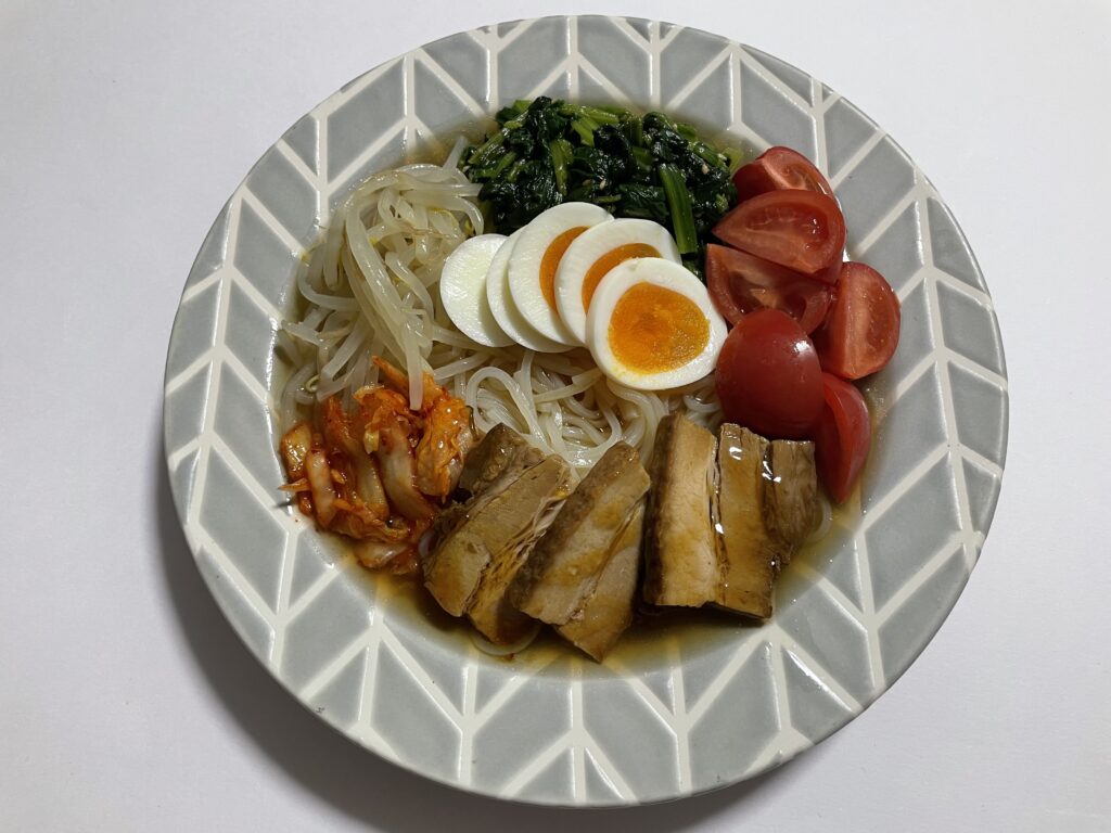 この日は市販の豚角煮(【Day.3】と同じもの)、カットトマト、刻みきゅうり、茹でもやし、キムチ、そして味玉はLEEレシピ内・野口真紀さんの「卵のめんつゆ漬け」で作ったものです。