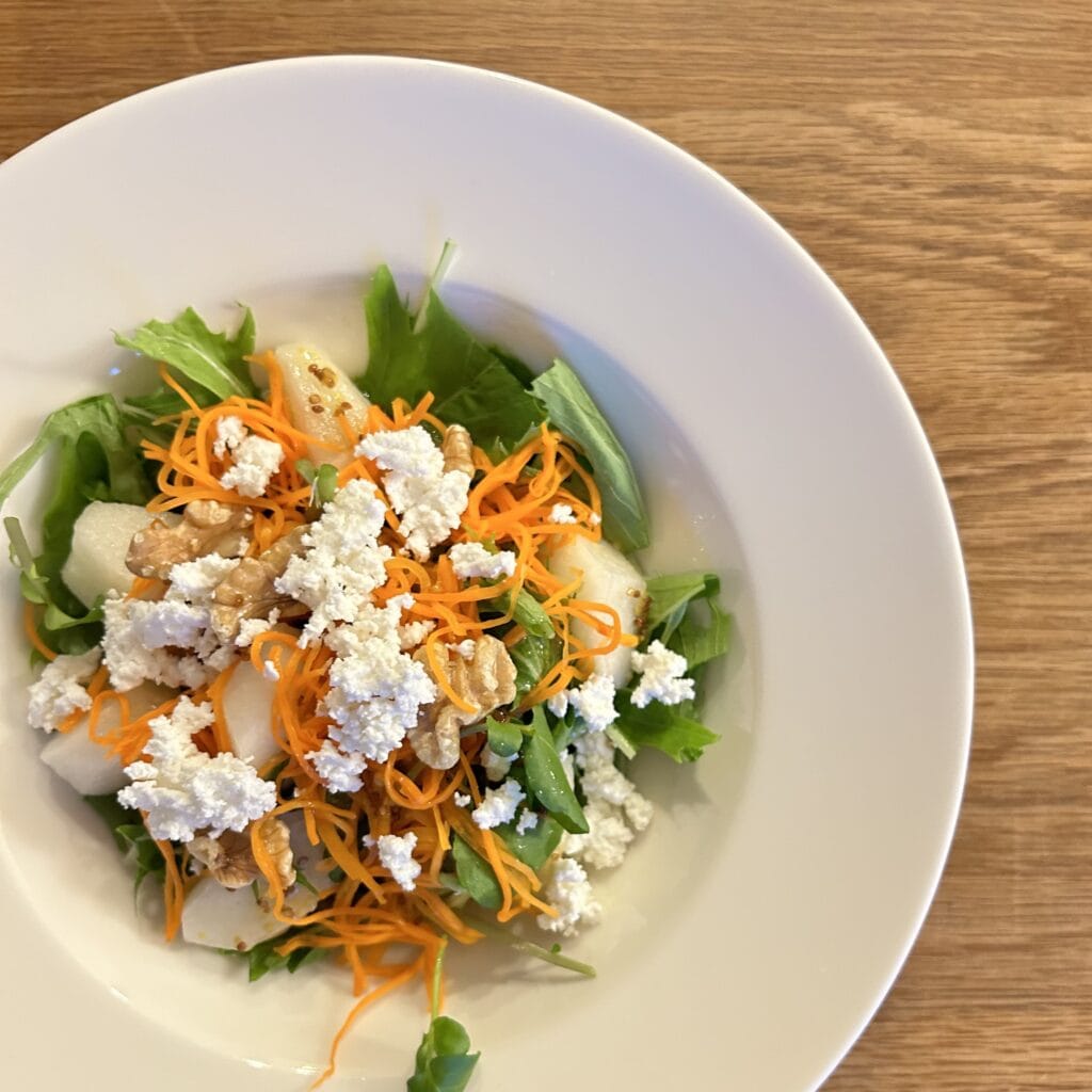 塩揉みした千切りのにんじん、水菜、胡桃、そして梨。
