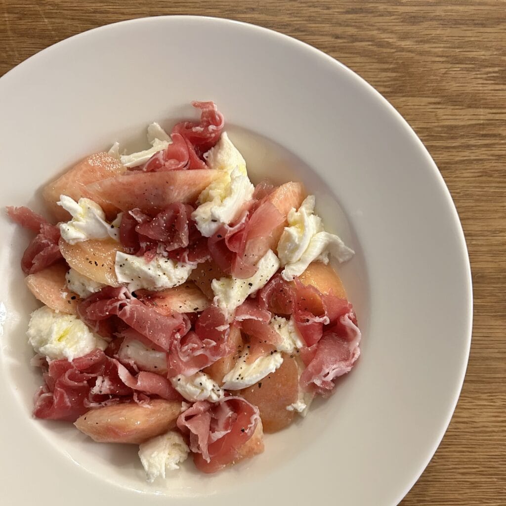 冷蔵庫の隅で出番を待っていた生ハム、プラス完熟桃とくればやっぱりこれ。