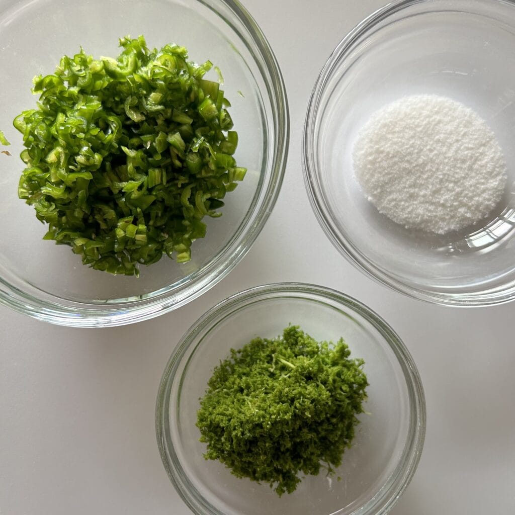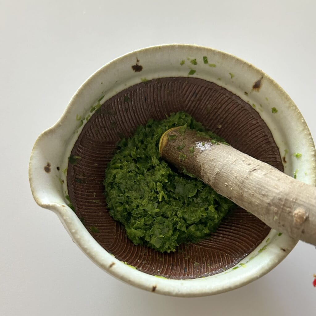 すりおろしたすだちの皮、刻んだ青唐辛子、塩をすり混ぜて。