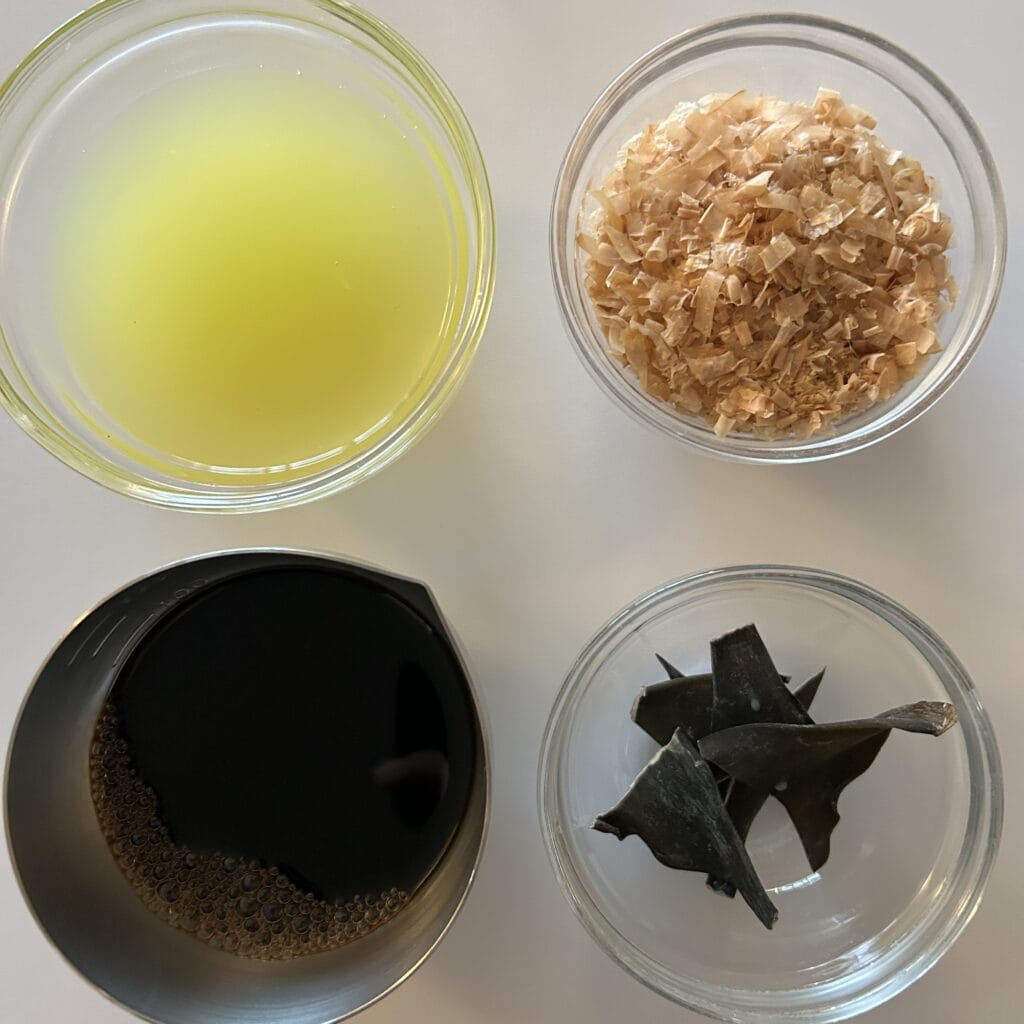 材料はすだち果汁、醤油、昆布、鰹節、(写っていませんが)みりん。