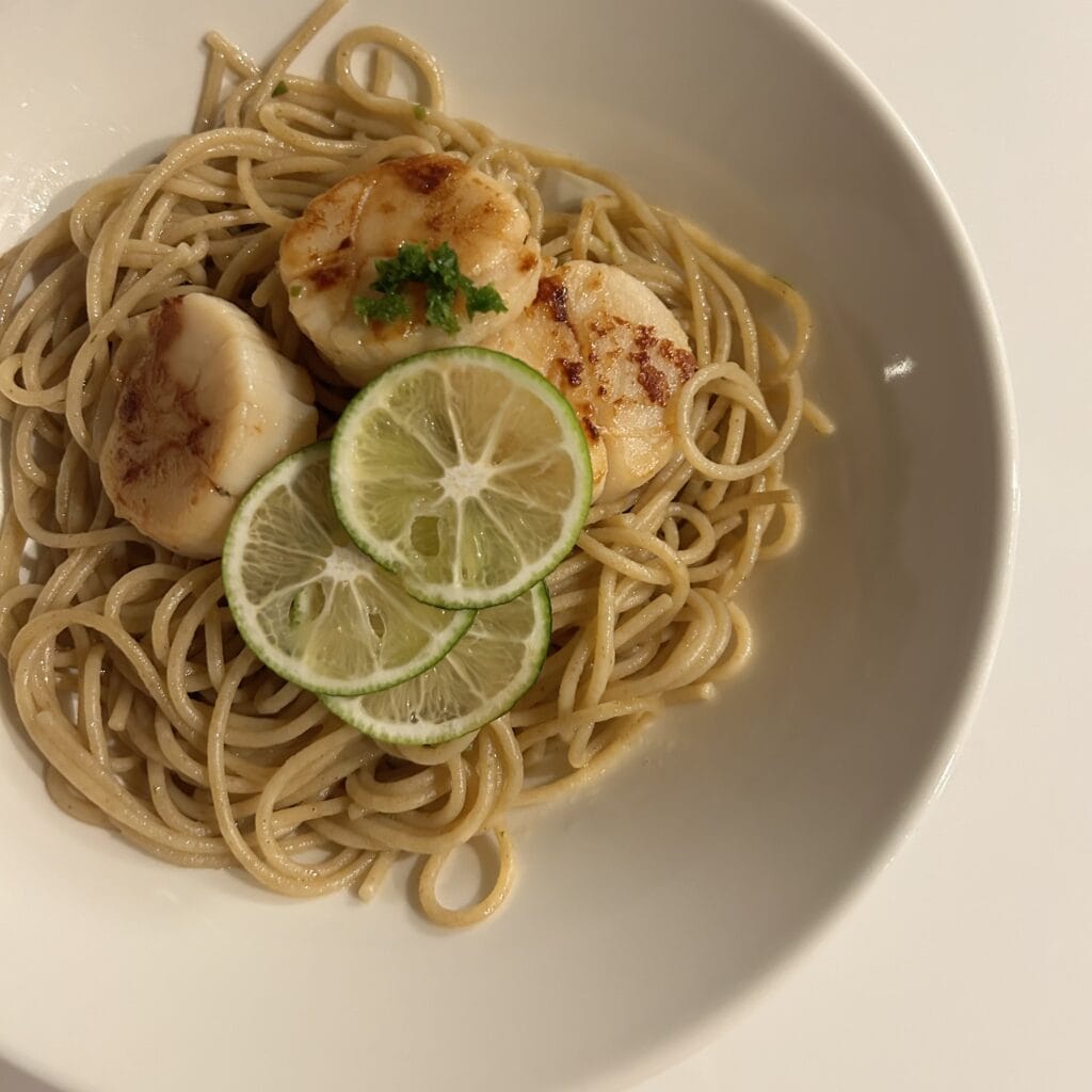 全粒粉パスタをすだち胡椒とオイルに絡めて、ソテーしたホタテをのっけただけ。